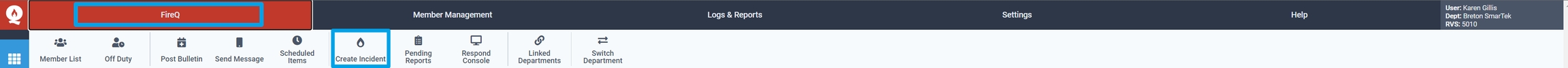 Navigate to the FireQ tab and click the CREATE INCIDENT button.