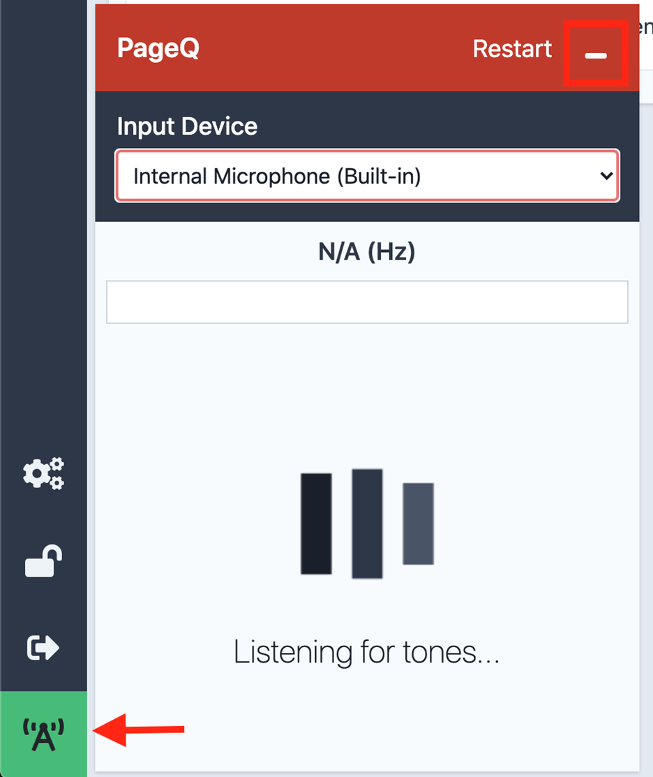 If the key is valid, PageQ will open in the bottom left of FireQ. It will automatically select the computers default input device. The input device may need to be changed if the correct one is not already selected. The use of a USB sound card adapter simplifies this.