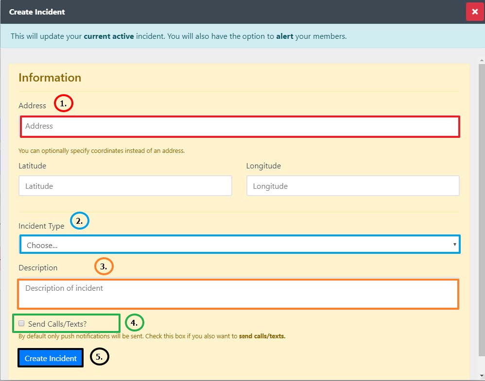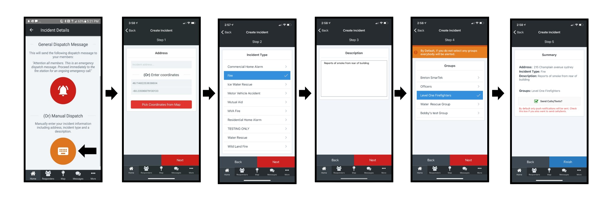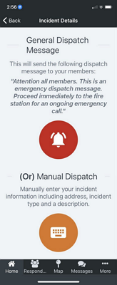 Manual Dispatch: Alternatively, fire departments can also self-dispatch firefighters by entering address/coordinates, incident type, and incident description. Firefighters also have the choice of dispatching the entire department or specific groups within the department.