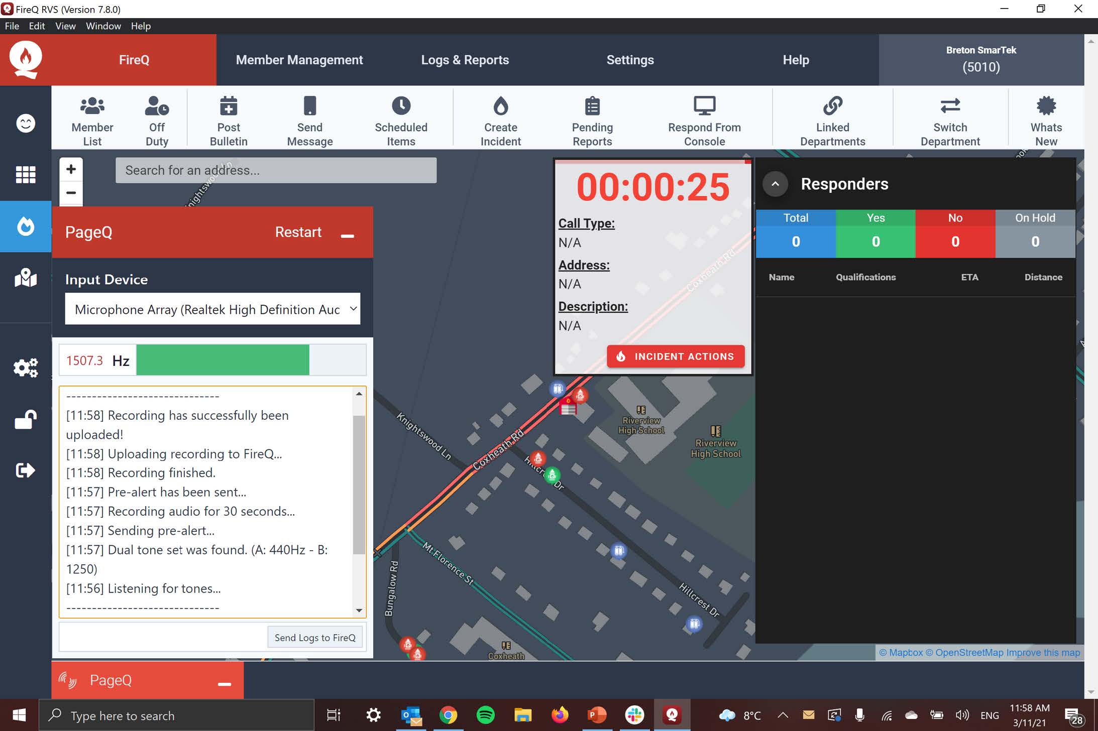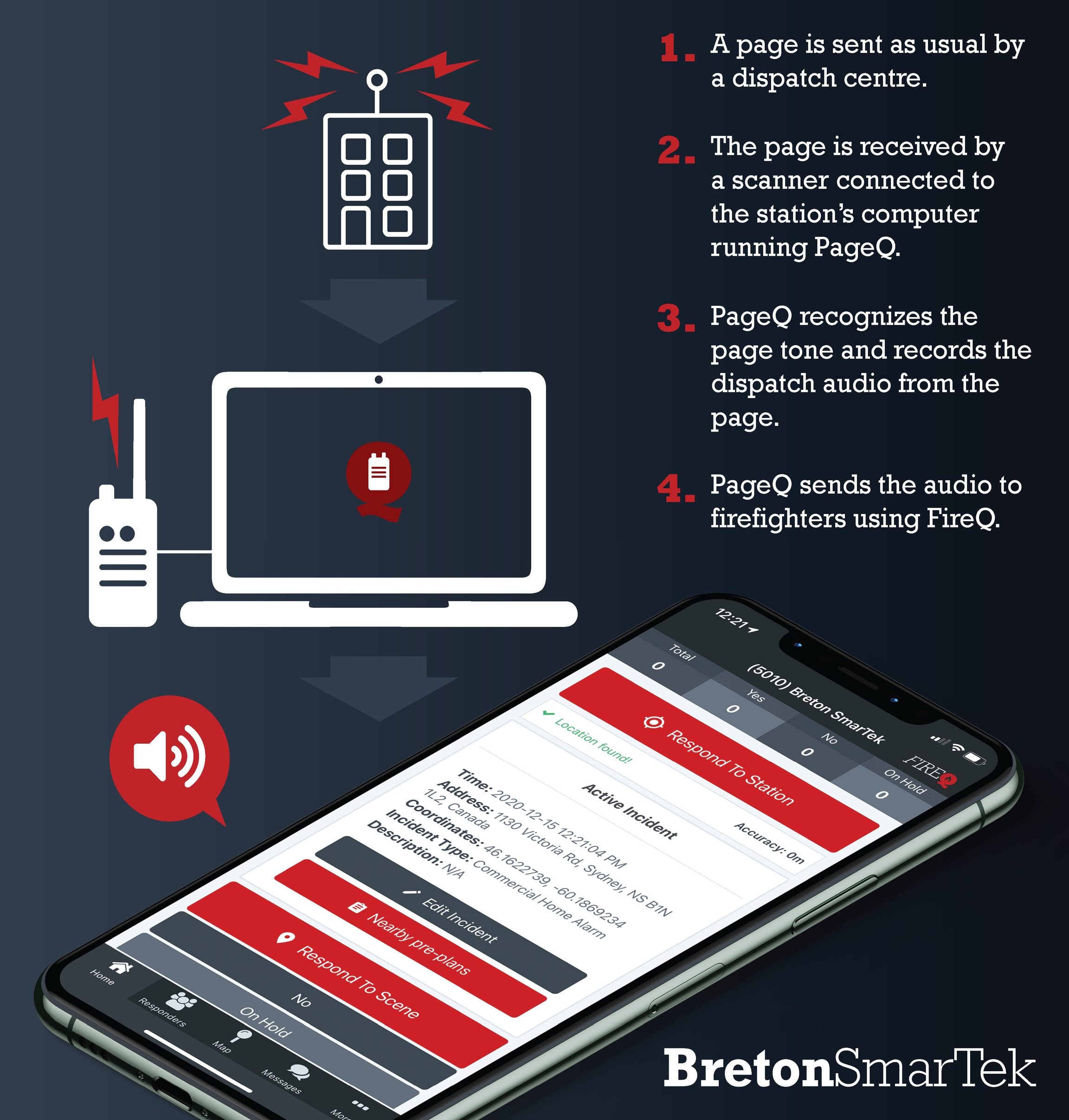For fire departments that do not have the support of a dispatch center, FireQ provides a page record and relay solution. PageQ behaves very much like a pager in that it listens for the unique tones of a fire department. These tones activate the PageQ module which captures and records the dispatch message that follows the tones.
