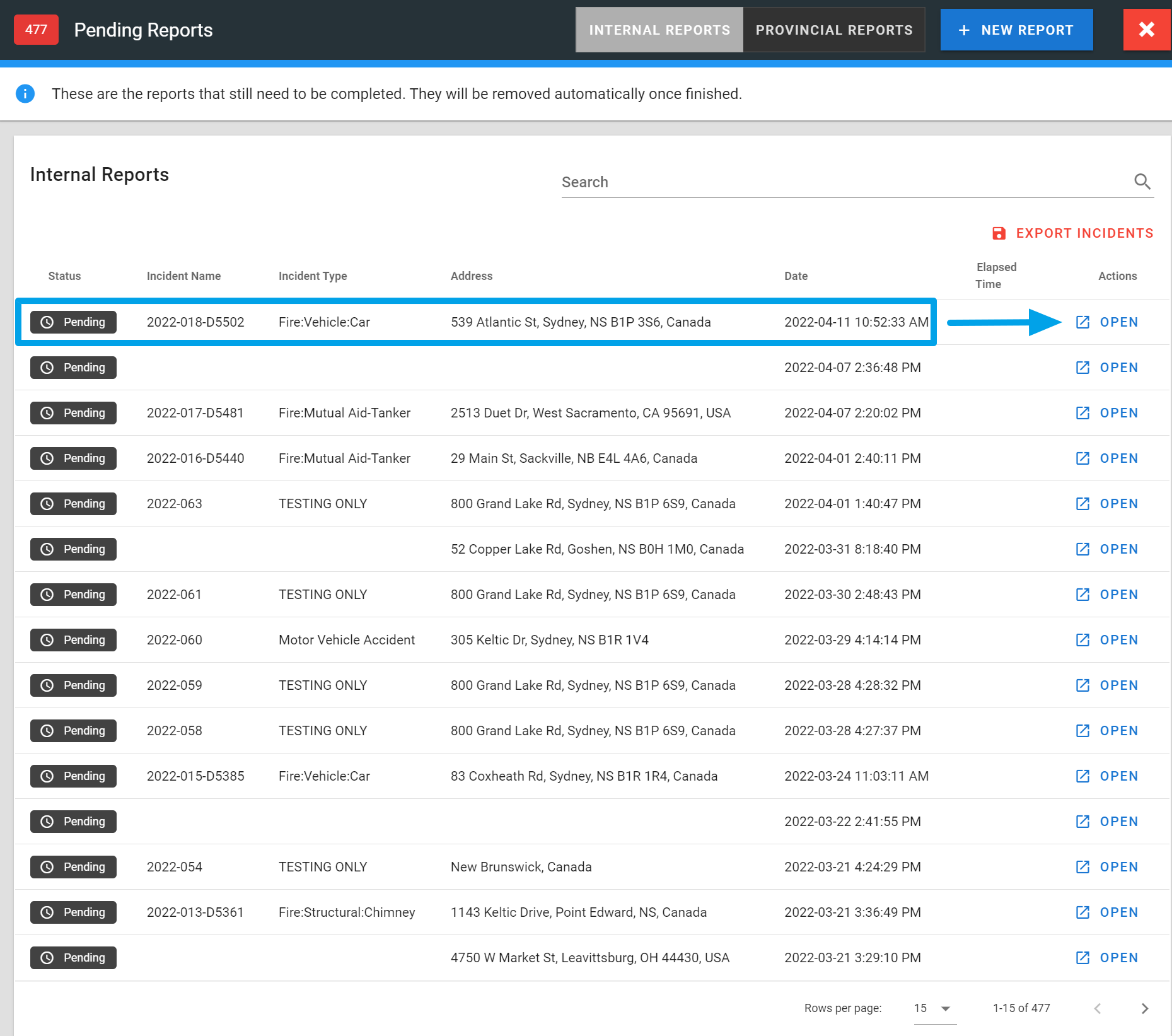 From the list of pending reports, select the report you want to complete and click the OPEN button.