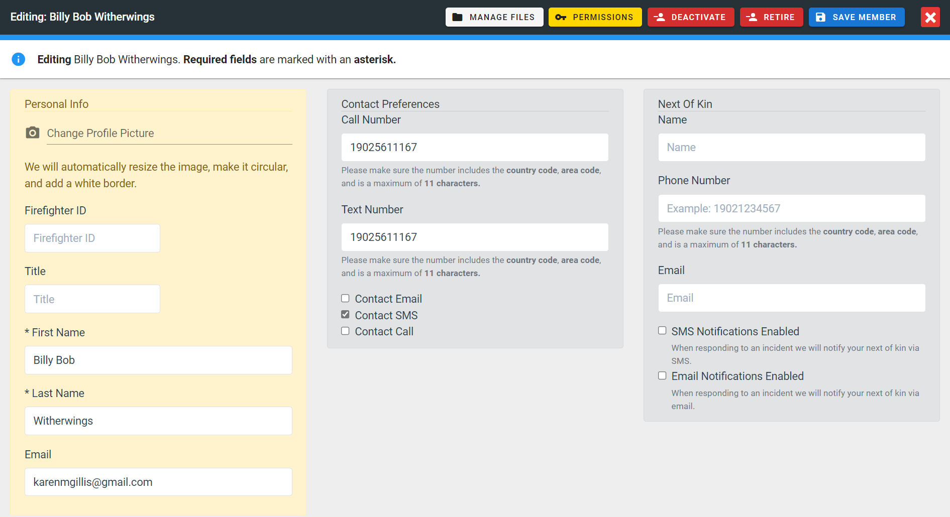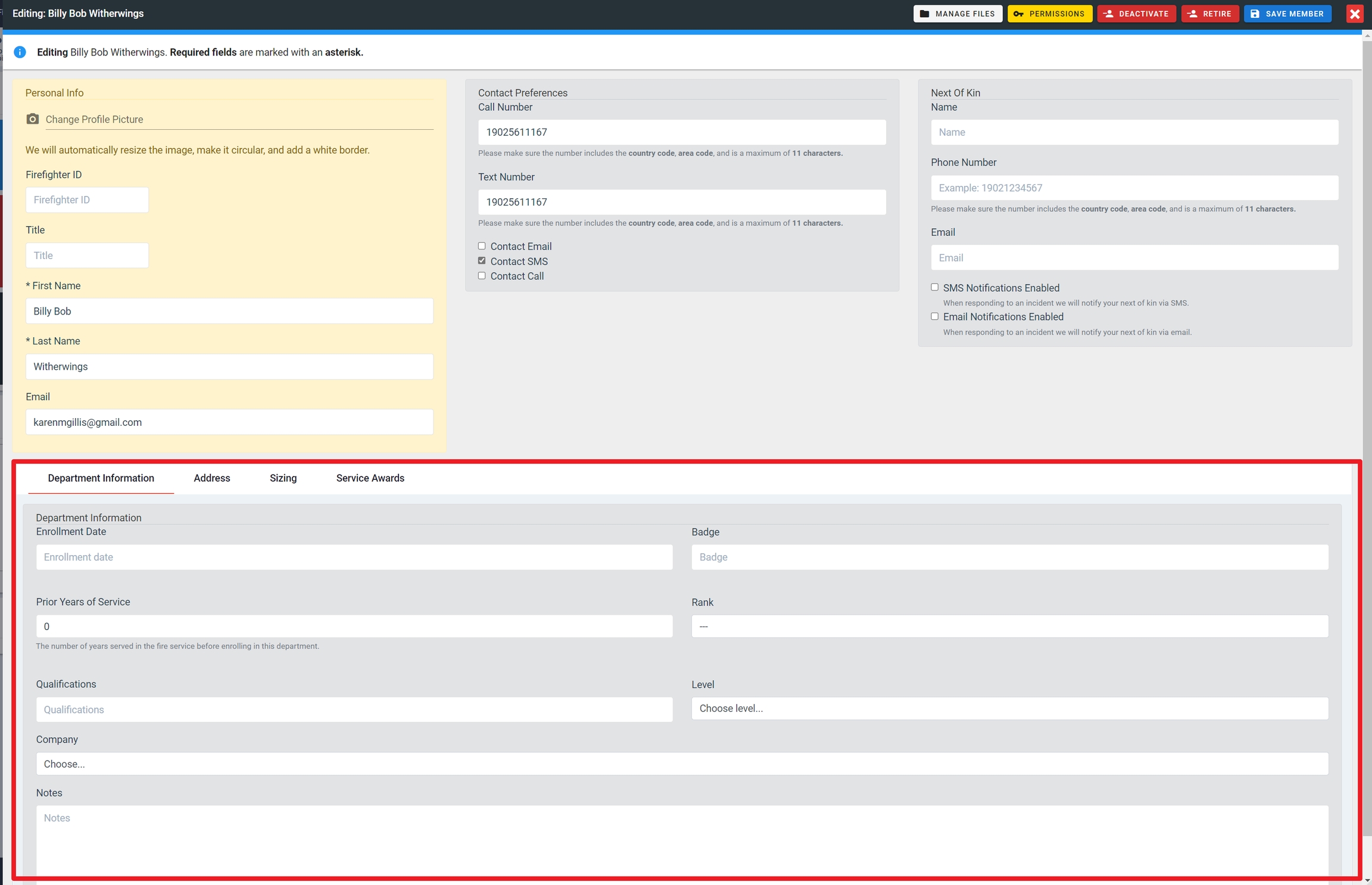 FireQ lets you track important firefighter information. To start, enter contact details for the firefighter.