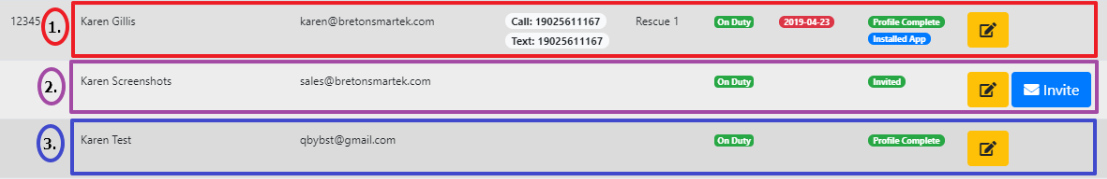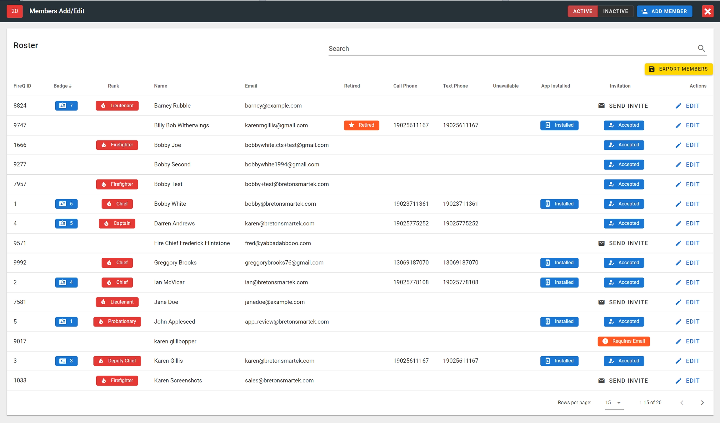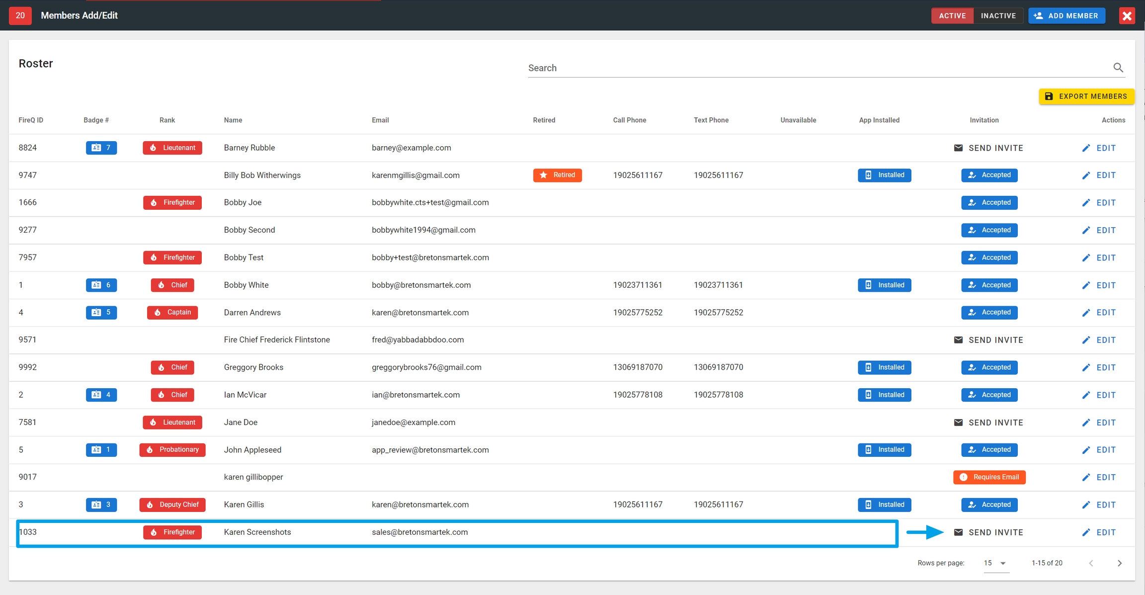Once you add a firefighter to your FireQ system and set their permissions, you can send that firefighter an invitation to download and set up the FireQ smartphone app. Find the firefighter in the list to whom you want to send an invitation and click the “Invite button”. You can see in the member list who has completed their profile set up and who has not. When the firefighter accepts the invitation and sets up login and password, his/her status will say “profile complete”. When the firefighter logs into the FireQ app for the first time, his/her status will say “installed app”.