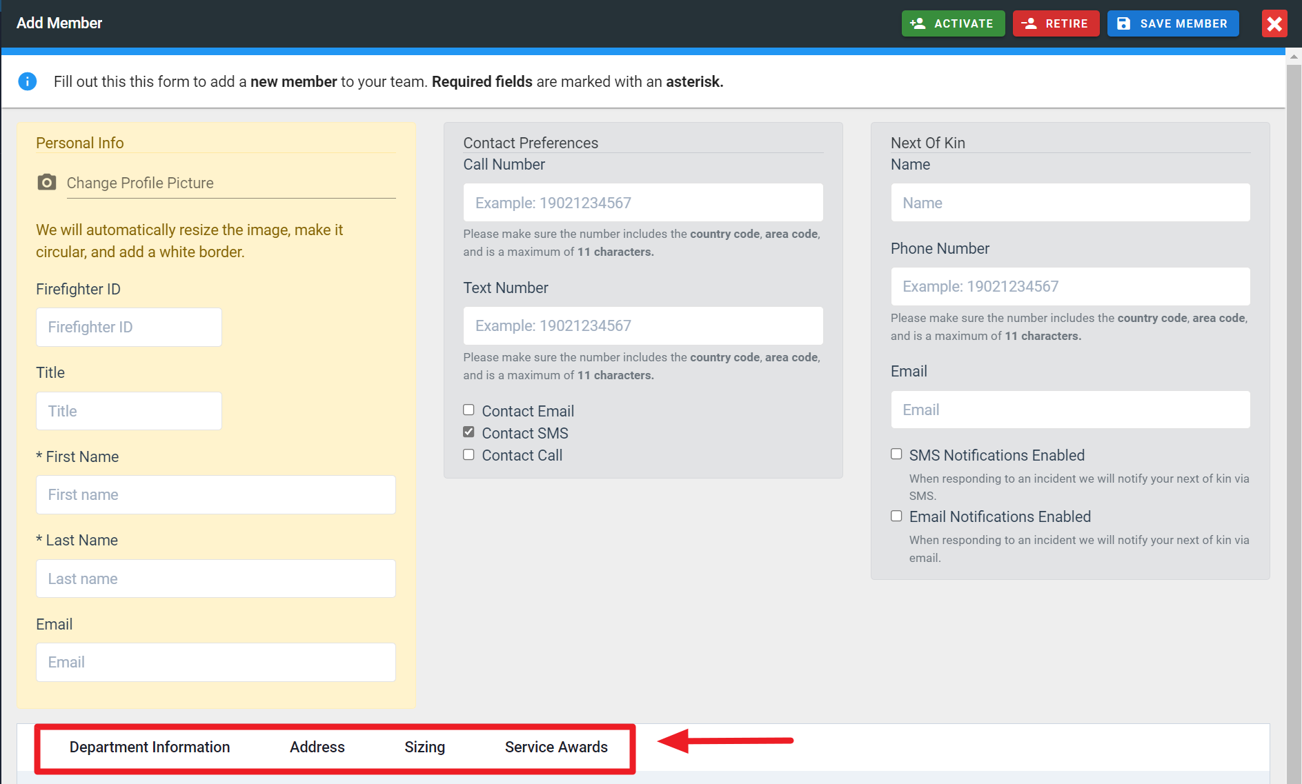 FireQ also lets you track other important firefighter information. Click the tabs below the contact details window to add: