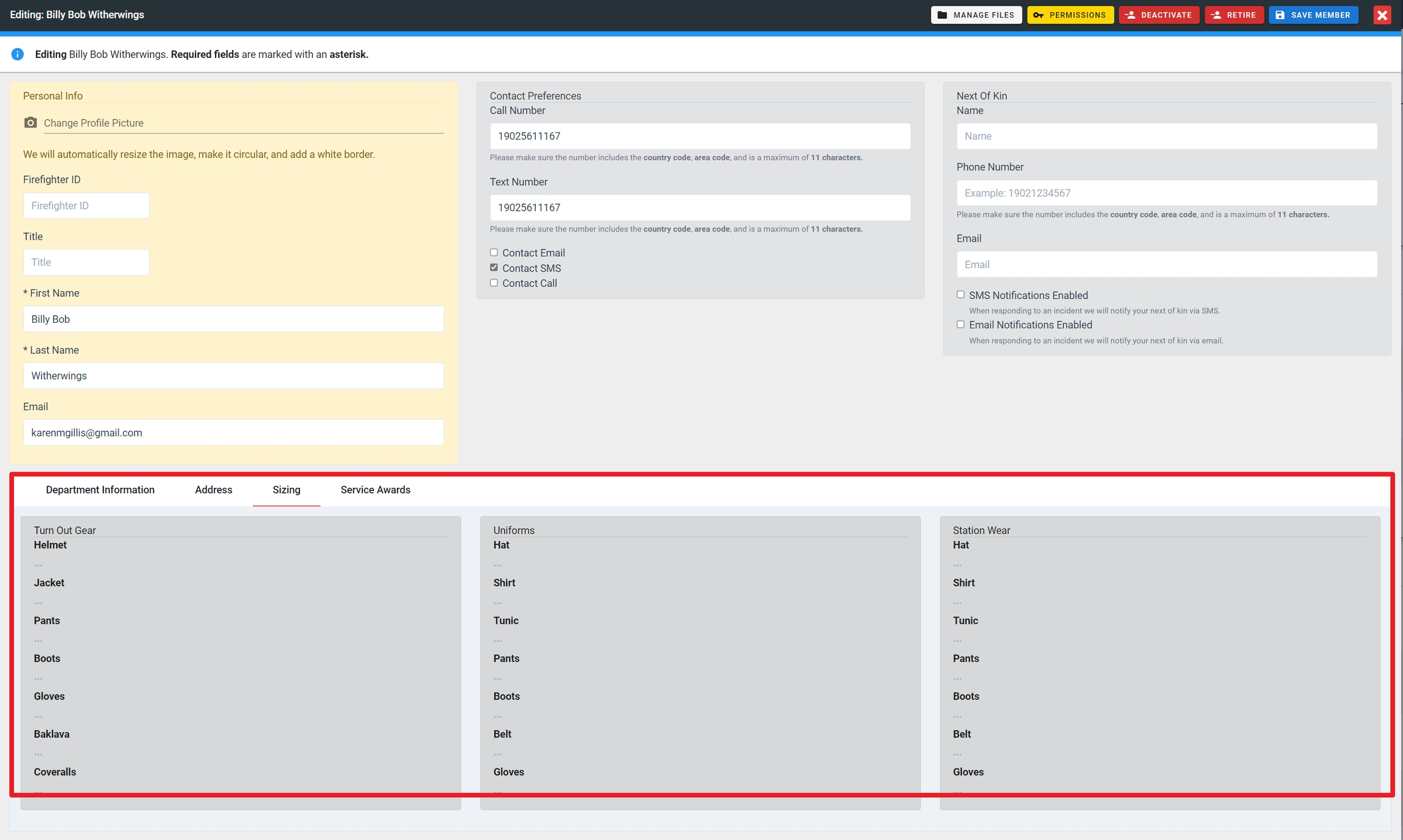 You can store the sizes worn by each firefighter to make ordering clothing and boots easier.