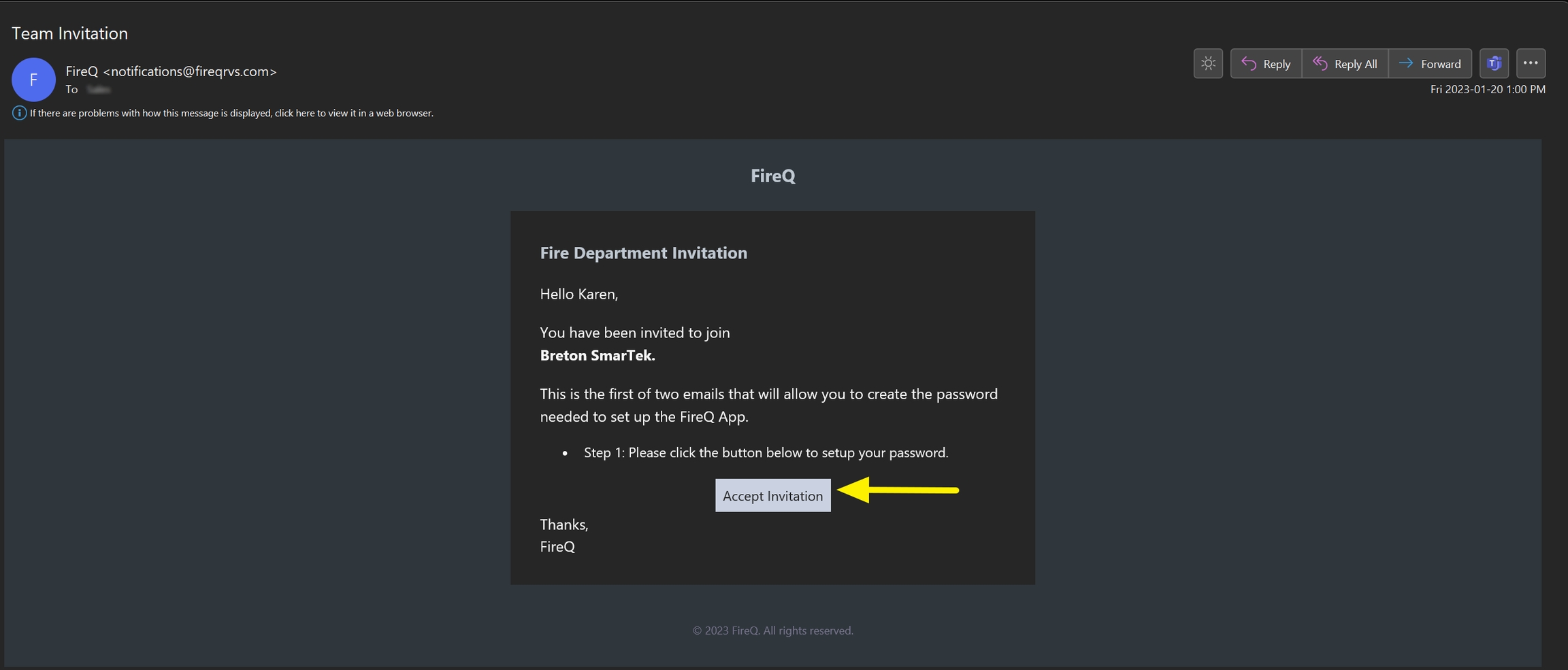 Installing and setting up the new FIREQ app requires just a few steps after an invitation email is sent. (An invitation email is sent to each firefighter by an administrator of the FIREQ system in your department.)