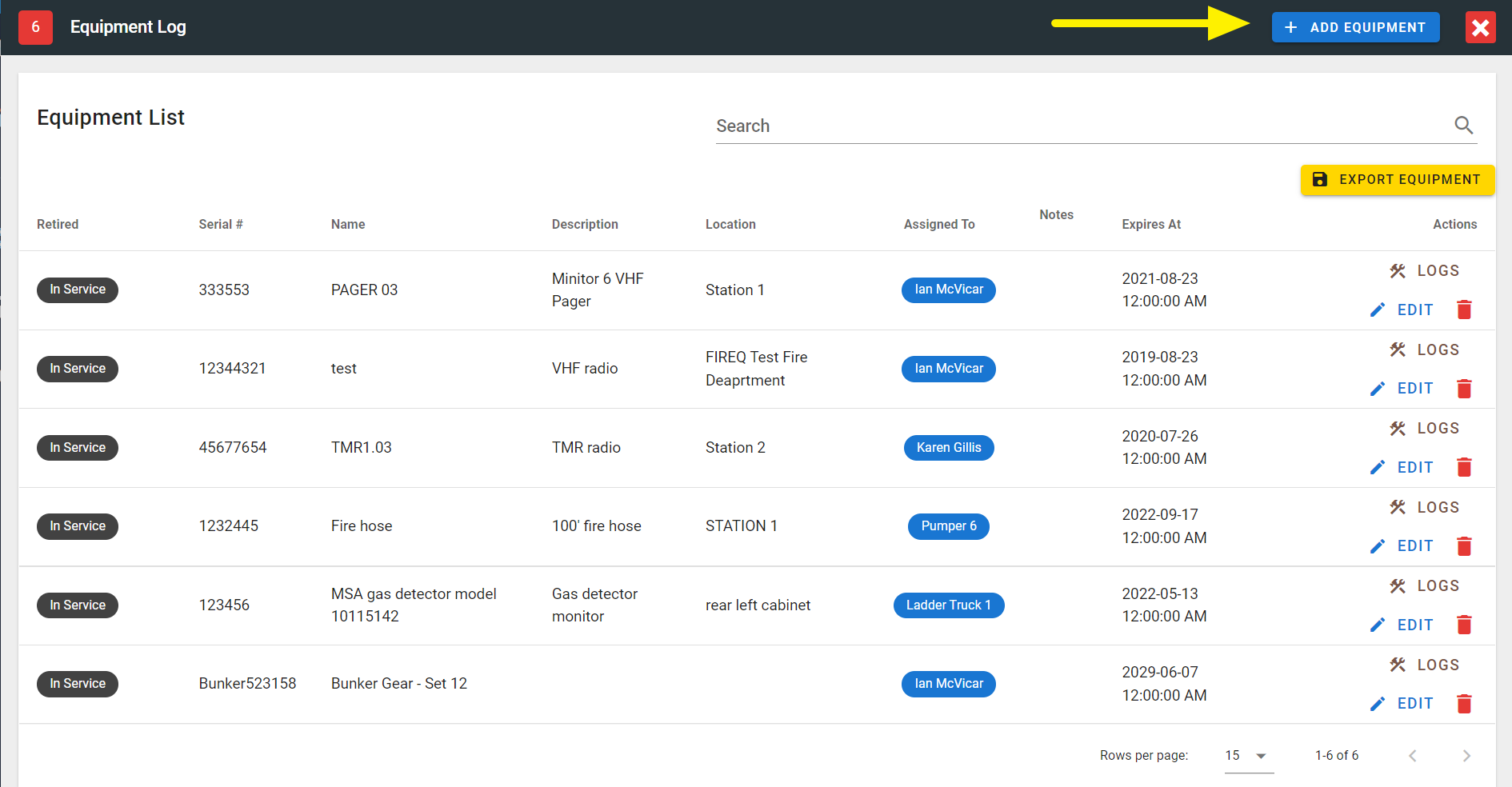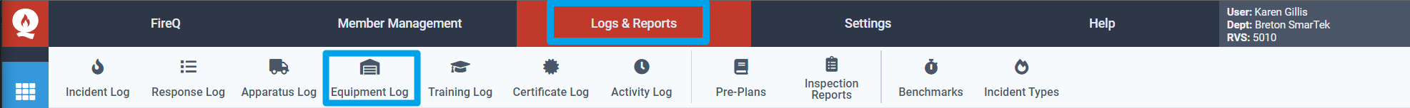 To add a piece of equipment to FireQ, navigate to the LOGS & REPORTS tab and click the EQUIPMENT LOG button.
