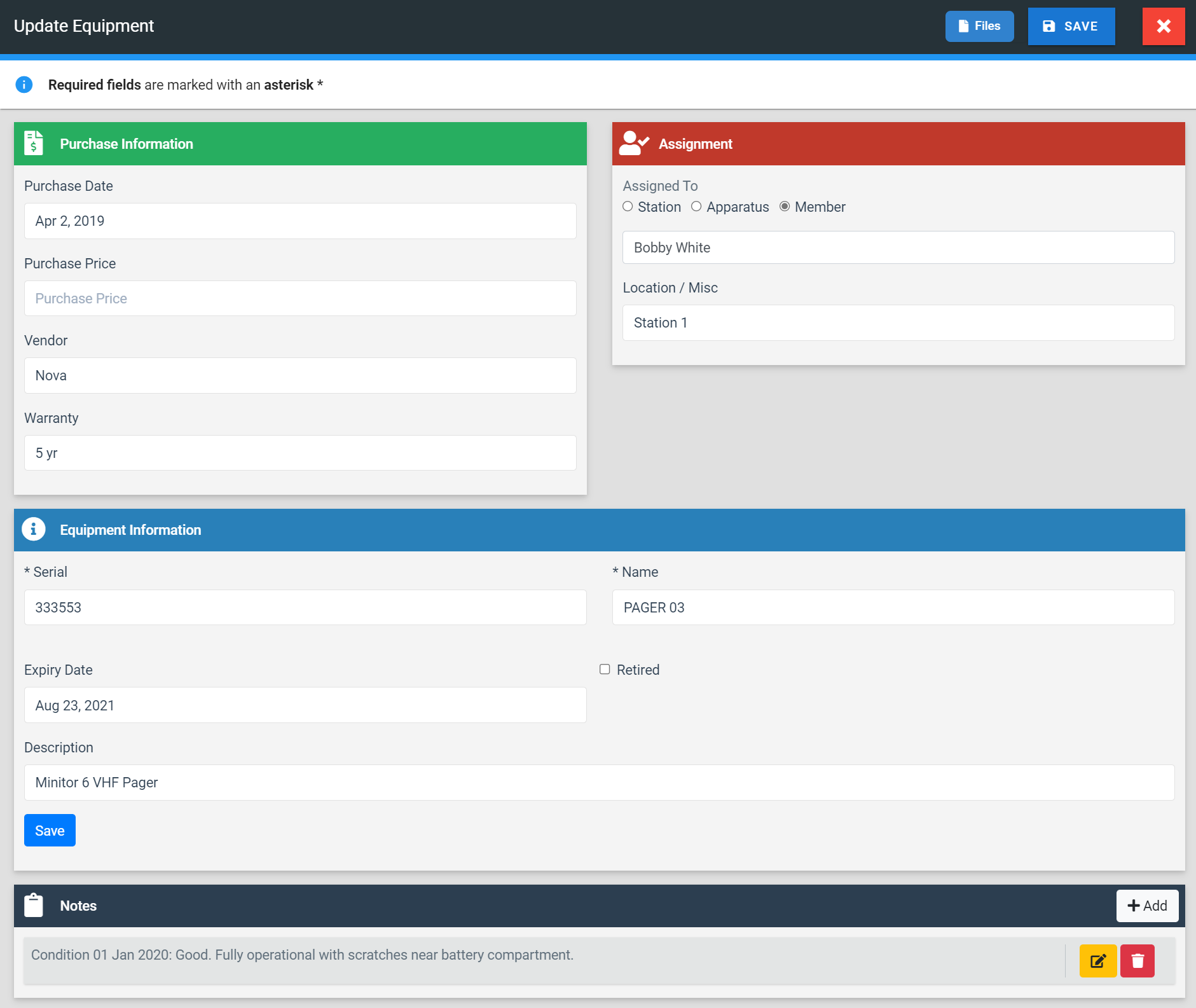 Assignment - you can assign the equipment to the station; to a particular apparatus; or to a member. Equipment assigned to members also appear in the member statistics.