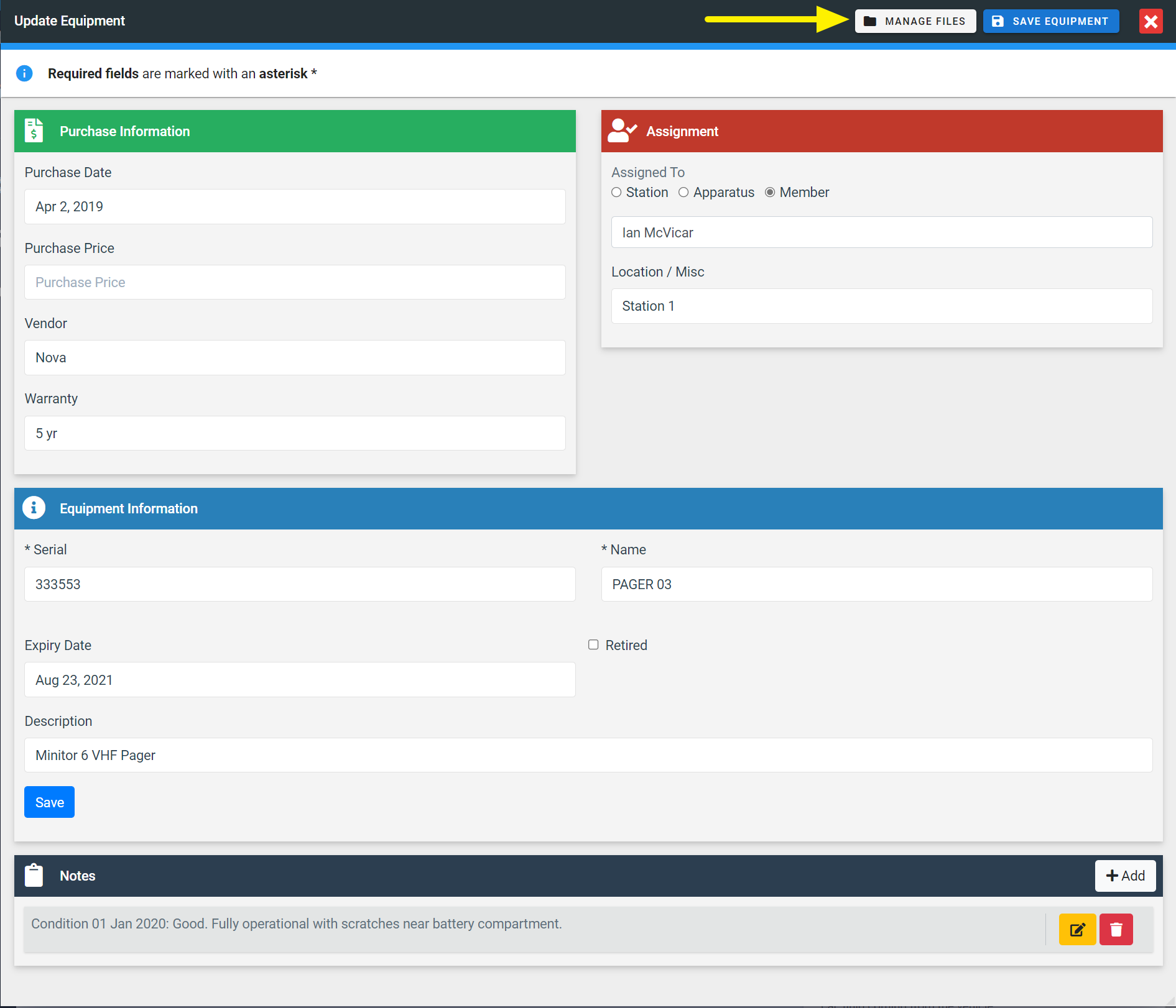 You can attach supplementary files to any equipment in the log. These things could include purchase receipts, equipment SOGs, and more.