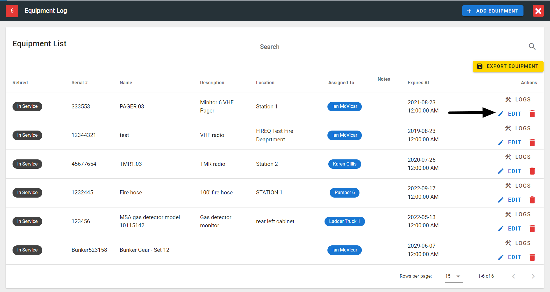To attach files to a specific piece of equipment, find the specific piece of equipment in the equipment list and click the EDIT button.