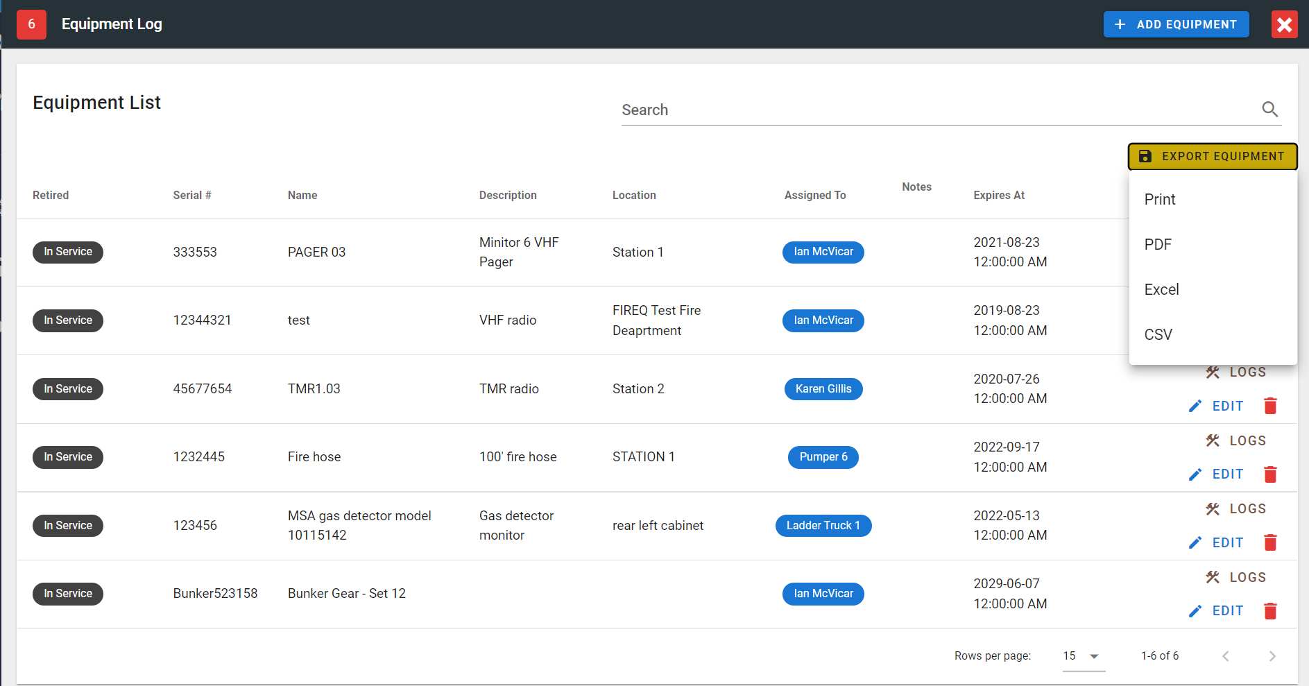 FireQ equipment log export options