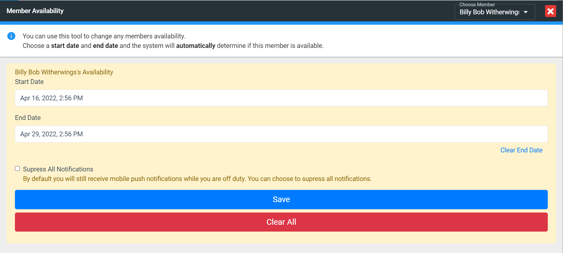 Enter the start date of when the firefighter will not be available and the date of their return. If the firefighter does not wish to receive any notifications at all while they are away, place a check mark next to Suppress All Notifications. If this box is not checked, firefighters will receive a push notification and an email, but they will not receive a text or a phone call.