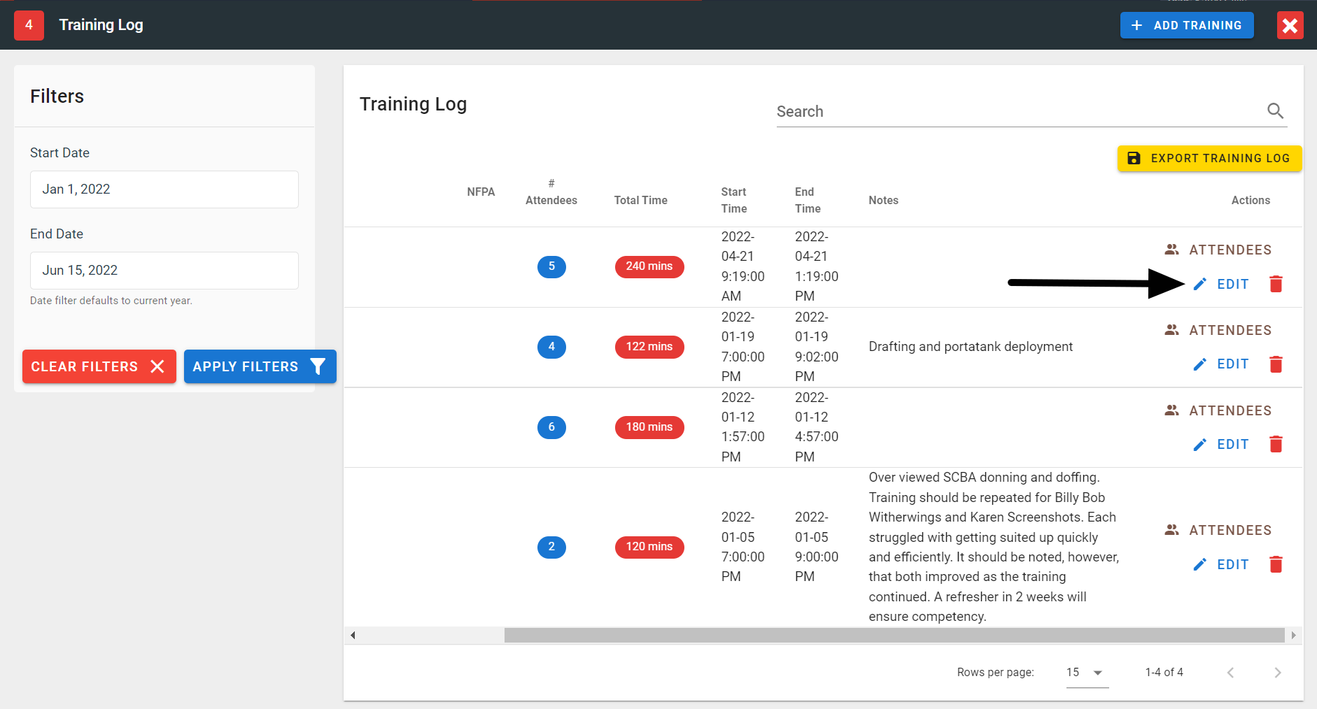To attach files to a specific training, find the specific training in the training list and click the EDIT button.