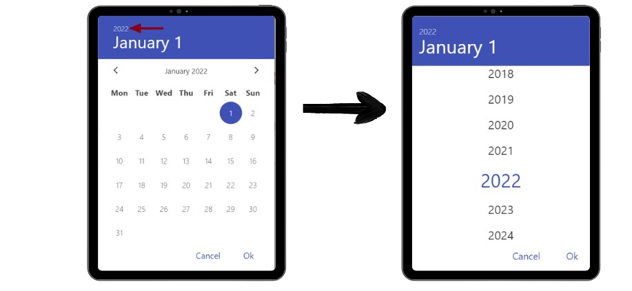 If you click on the year, a list of years from you can choose appears. Select the desired year and click OK.