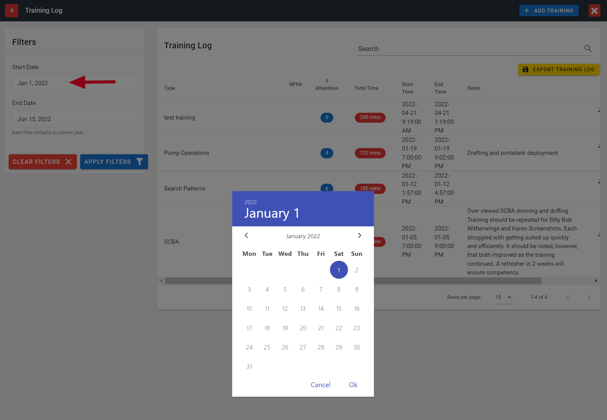 To search training logs by date, click in the "start date" box to bring up the date picker and select the start date of the records you want to see. Enter the start and end dates and click the APPLY FILTERS button.